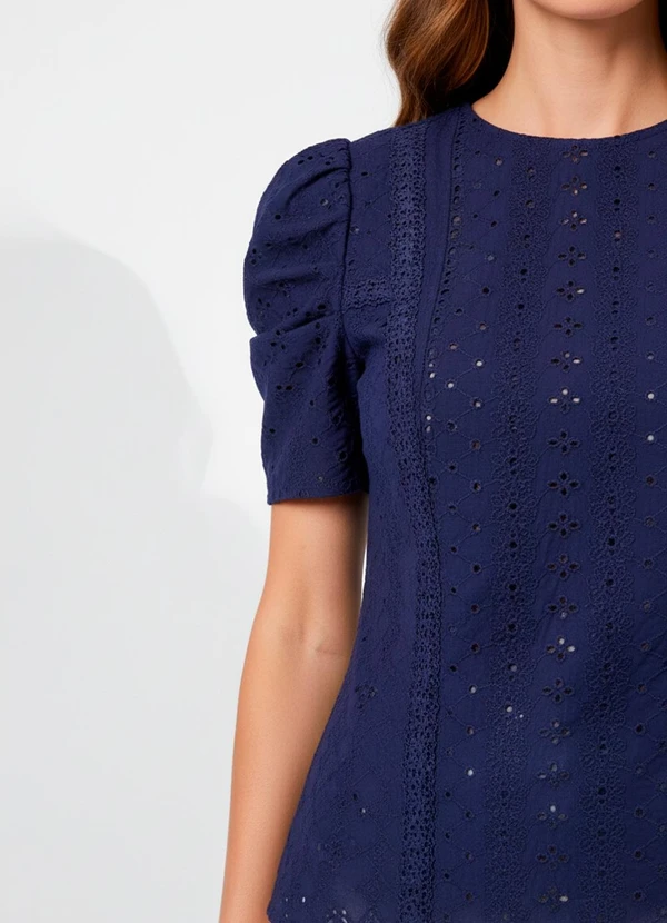 Blusa Azul Marinho em malha laise com delicados detalhes vazados e mangas bufantes que adicionam charme único. Ideal para o dia a dia, trabalho ou eventos casuais. Versatilidade e estilo em uma só peça!