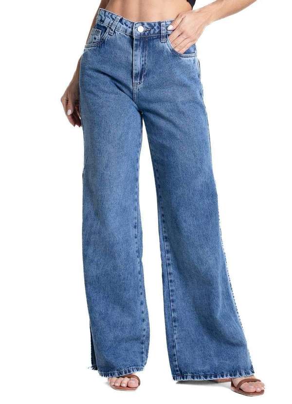 Calça feminina confeccionada em jeans. O modelo possui cintura super alta, gancho no lugar e caimento amplo da coxa até a barra. Cintura alta Fechamento através de um botão e zíper Bolsos frontais e posteriores funcionais Barra desfiada Tecido: Jeans Tipo de Lavagem: Azul Cor: AzulComposição: 100% ALGODÃO