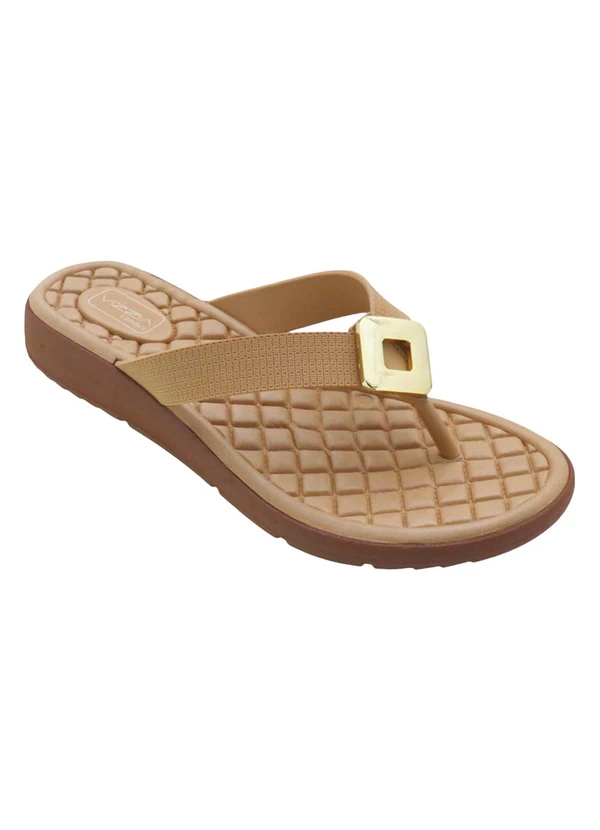 Chinelo desenvolvido em material sintético com adereço dourado no cabedal. Palmilha Confort. Solado em PVC. Salto 3 cm.