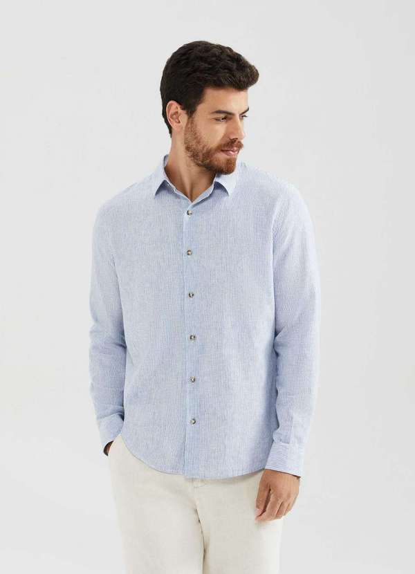 Camisa masculina manga longa listrada em linho, a clássica repaginada que você precisa ter no armário. Elaborada em tecido de linho fio tinto com padronagem listrada, possui modelagem regular, solta do corpo e confortável. Detalhes da peça: Em tecido Fio tinto Modelagem regular Manga longa Gola colarinho Vista com botões Pala costas
