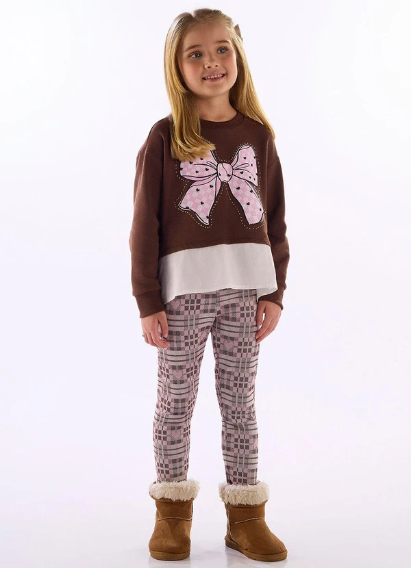 Quimby - Conjunto Blusão Laço Legging Xadrez Marrom