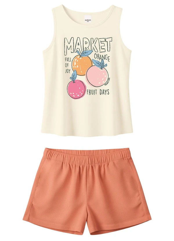 Conjunto composto por blusa em meia malha e shorts em moletinho, garantindo conforto e leveza para o dia a dia. Estampa ¿Market / orange / full of joy / fruit days¿ com aplicação de glitter que adiciona brilho e destaque ao visual. Invista!