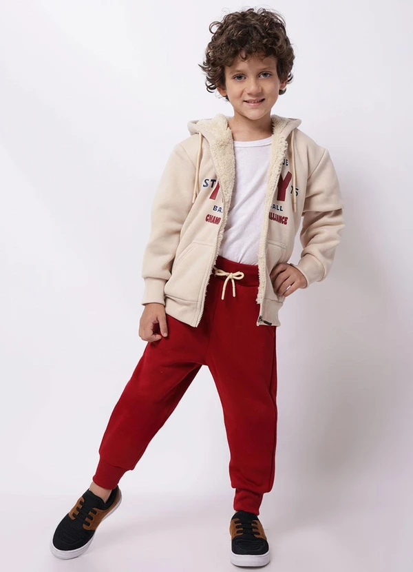 Conjunto moletom infantil com estampa NY, ideal para um visual moderno e cheio de estilo. A blusa com capuz na cor bege conta com cordão de ajuste e bolsos frontais, oferecendo praticidade e conforto para o dia a dia. A calça vermelha, que combina com os detalhes da blusa, possui bolsos funcionais e cordão de ajuste no cós, garantindo melhor encaixe e liberdade de movimentos. Confeccionado em moletom macio e aconchegante, o conjunto é perfeito para os dias mais frescos.