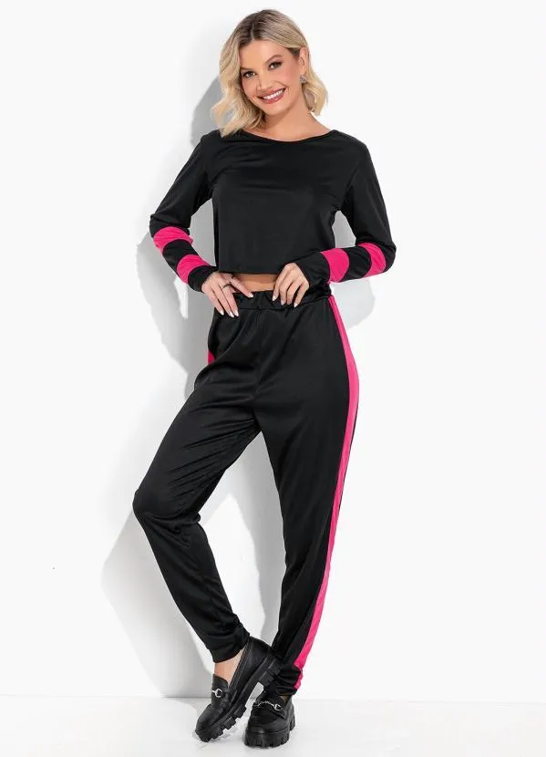 Moda Pop - Conjunto Preta e Pink com Cropped e Calça