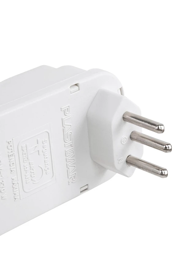 Com luz led indicativa. Cor: Branco. Adaptador multiplo com chave liga e desliga. Com 3 tomadas, 2 polos + terra. Corrente máxima: 10A em 250 V. Não possui USB.