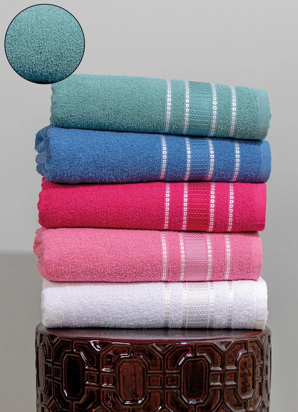 com 97% algodão, 2% viscose e 1% poliéster. Com 1 toalha de banho (60x125 cm) e 1 toalha de rosto (45x65 cm). Gramatura: 270 g/m².