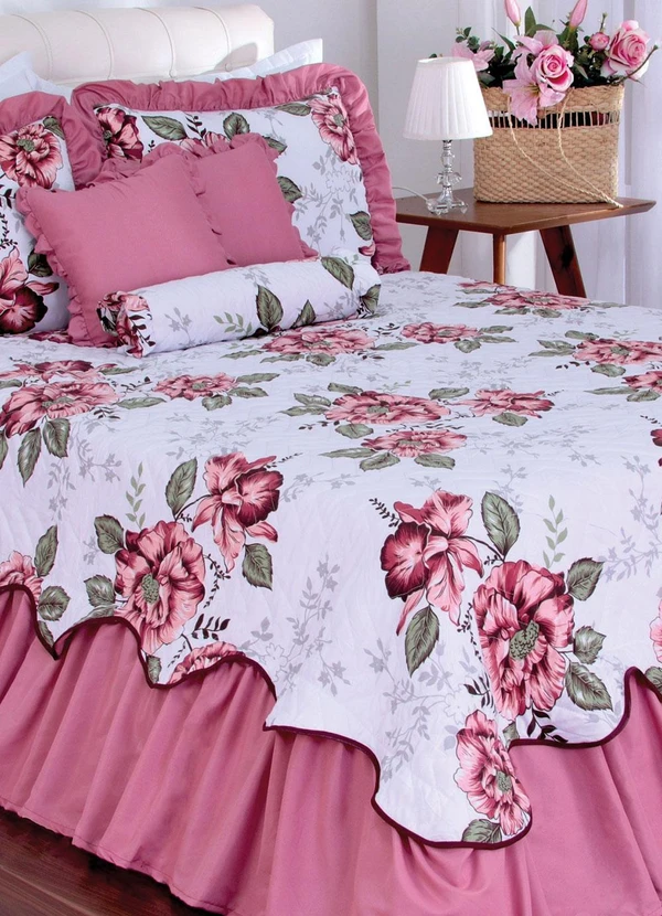 em poliéster e polipropileno. Com 1 cobre leito (240x250 cm) e 2 porta travesseiros (50x70 cm), 2 capas de almofada (40x40 cm) e 1 capa de rolinho tamanho regular. Com cobreleito matelassado com babado.