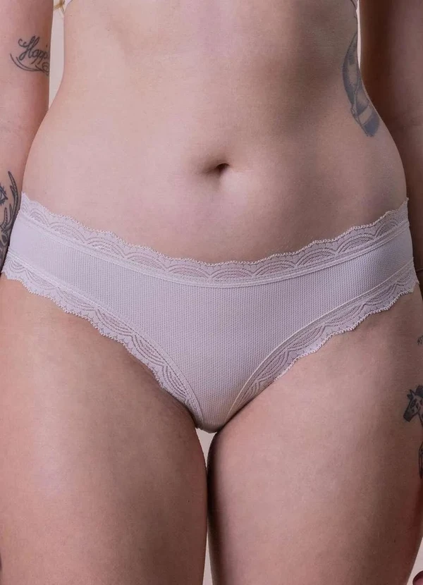 Características: Calcinha modelo biquíni cintura reta Laterais intermediárias e decotada bumbum Aplicação de renda Dayluxe no cós e cavas das pernas Renda confortável e não pinica Tecido Soft Piquet,uma mistura inusitada da microfibra Alquimia com a supermicrofibra Allumé, e elastano 40 Acabamento hidrófilo que potencializa a absorção e secagem rápida Fundo em algodão Composição: 89% Poliamida, 11% Elastano Fundo: 100% Algodão
