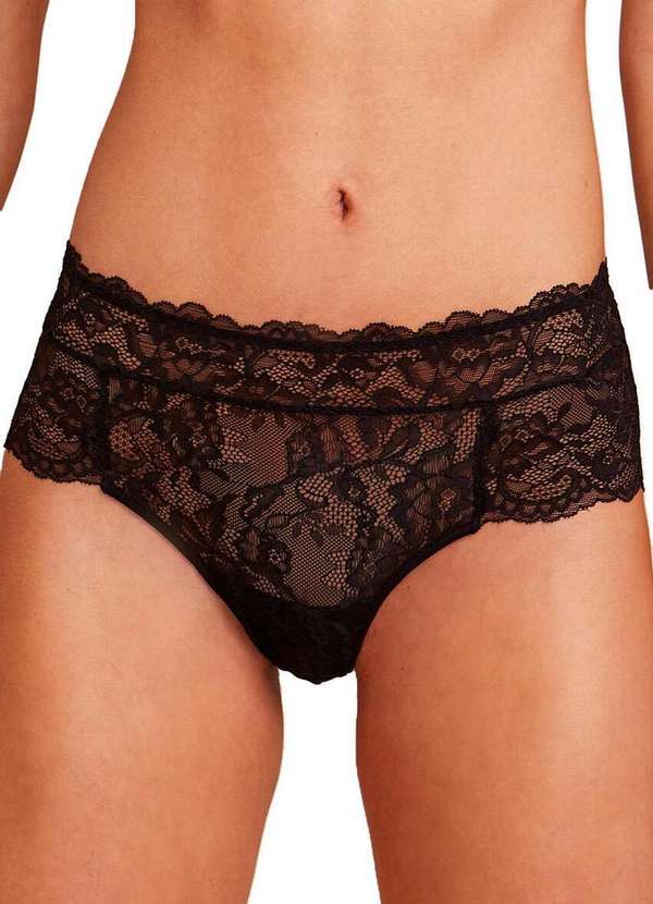 Características: Calcinha modelo caleçon Bumbum com modelagem anatômica Cavas das pernas com acabamento invisível Cós com bico da renda aparente e finalizado com elástico macio Renda com design exclusivo Ideal para todos os tipos de quadril Fundo em algodão Modo de lavagem: Lavagem a mão Não alvejar ou secar em tambor Secagem em varal por gotejamento a sombra Não passar ou utilizar vaporização Não limpar a seco Não limpar a úmido Composição: 90% Poliamida e 10% Elastano Forro: 100% Poliester