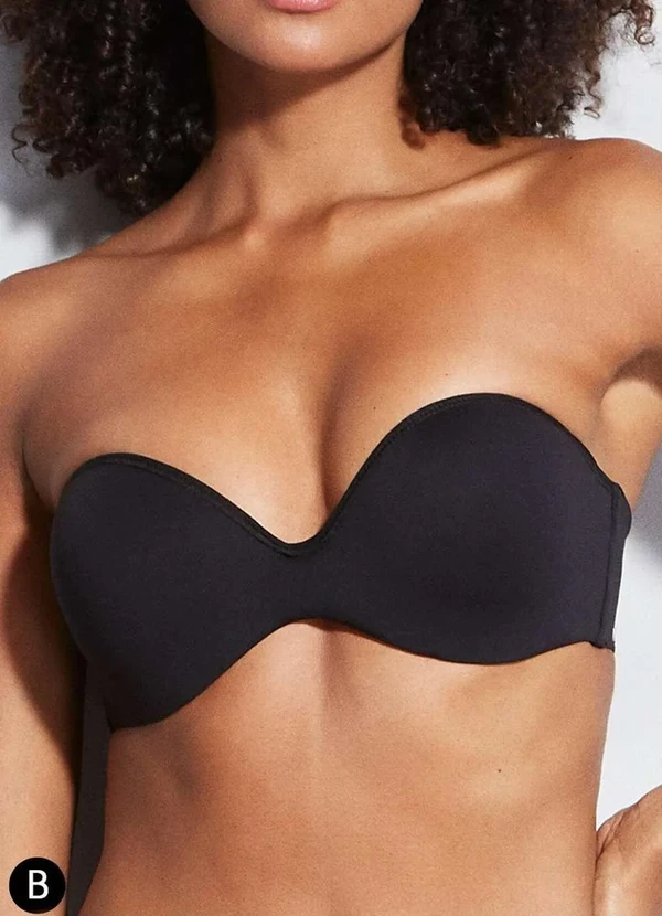 Características: Sutiã bustiê em microfibra com bojo push-up em espuma macia. Laterais com elástico largo. Aplicação de silicone para o uso sem alças. Fecho em microfibra com quatro ajustes. Alças removíveis. Ideal para seios pequenos ou médios. Outros Detalhes: Taça B Modo de Lavagem: Lavar a mão. Não usar cloro. Não usar tambor rotativo. Secagem por gotejamento. Não passar ou utilizar vaporização. Não limpar a seco. Limpeza a úmido pro- normal. Composição: Corpo: 90% Poliamida e 10% Elastano. Forro: 100% Algodão. Forro Bojo: 100% Poliéster.
