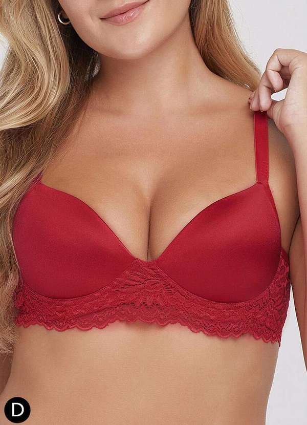 Características: Sutiã com aro e bojo Busto forrado em microfibra Base e costas em renda delicada Alças fixas ajustáveis Fecho em colchete nas costas Atende tamanho Plus Size Outros Detalhes: Taça D Composição: Corpo: 90% Poliamida, 10% Elastano Bojo: 91% Poliamida, 09% Elastano Forro Frente Central: 100% Poliamida Forro Copa: 100% Poliéster