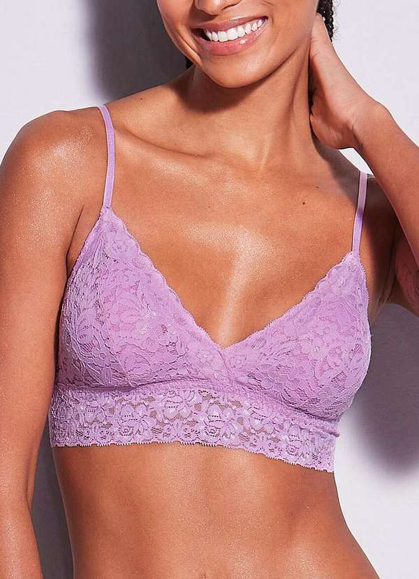 Características: Top triângulo. Forro no busto para maior sustentação. Sem aro com bojo removível. Alças fixas e reguláveis. Cós de renda. Super confortável. Indicado para leve e média sustentação. Modo de Lavagem: Lavar a mão. Não usar cloro. Não usar tambor rotativo. Secagem por gotejamento. Não passar ou utilizar vaporização. Não limpar a seco. Limpeza a úmido pro- normal. Composição: Renda: 90% Poliamida e 10% Elastano. Forro Tule: 96% Poliamida e 04% Elastano.