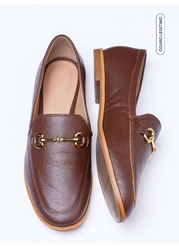 Principessa - Mocassim em Couro Marrom com Fivela de Metal Dourada Carlota