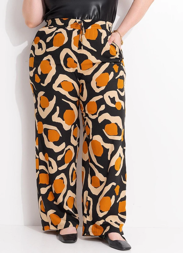 Calça modelo pantalona em viscose plana. Possui elástico na cintura e bolsos. Estampada com animal print/oncinha moderna. Perfeito para trabalho ou dia a dia.