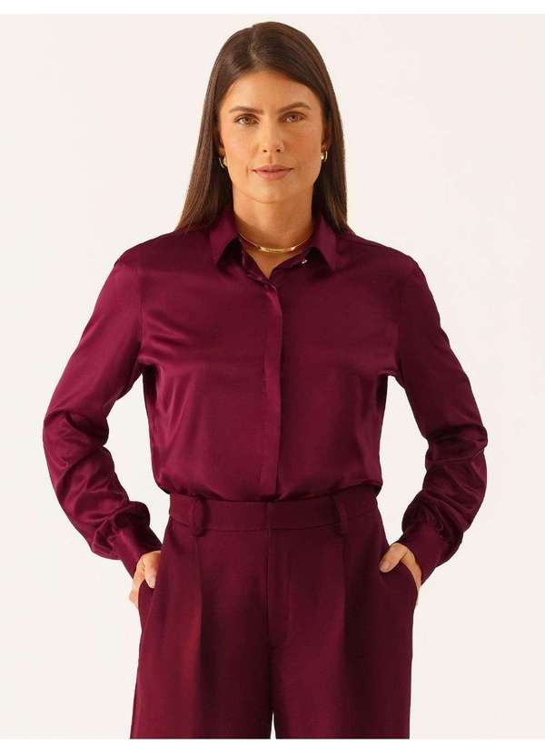 Principessa - Camisa Manga Longa Regular em Cetim Vinho Elizangela