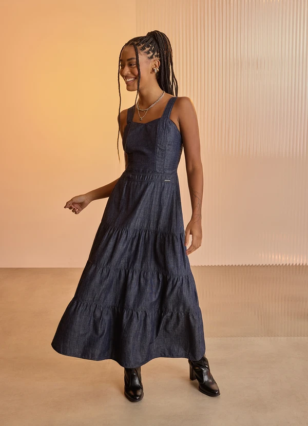 Lunender - Vestido Midi Chá de Alças em Jeans Azul