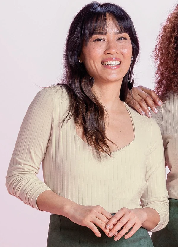 Marialícia - Blusa Feminina Canelada Decote Diamante Bege