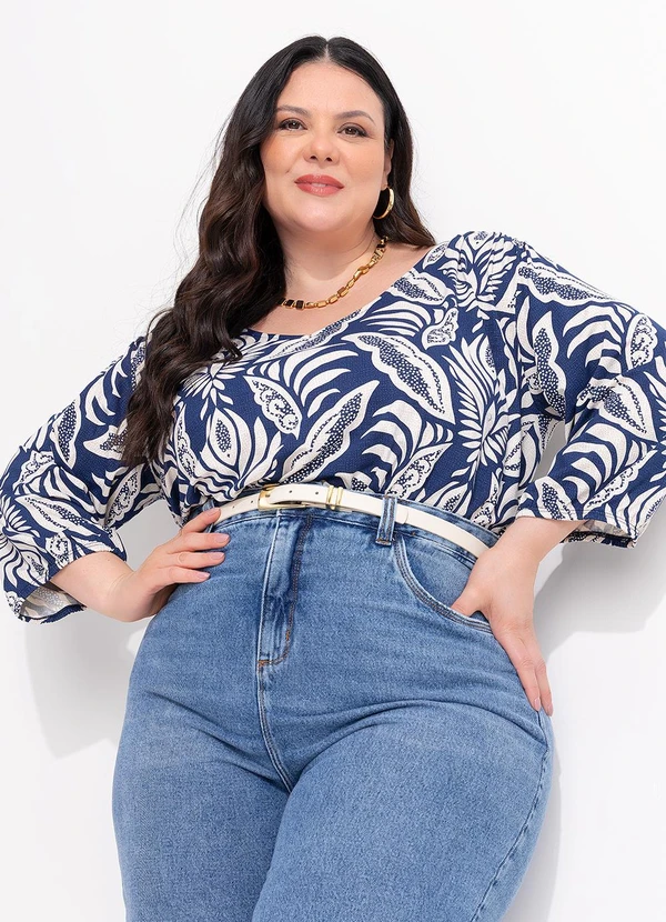 Blusa estilo bata, soltinha com decote V e mangas bufantes com elástico 3/4. Estampado em folhagem azul boho.