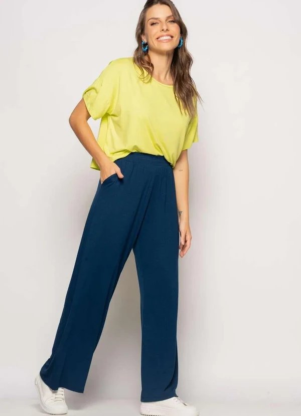 Salvatore Fashion - Calça Wide Leg com Bolso Malha Fashion Azul