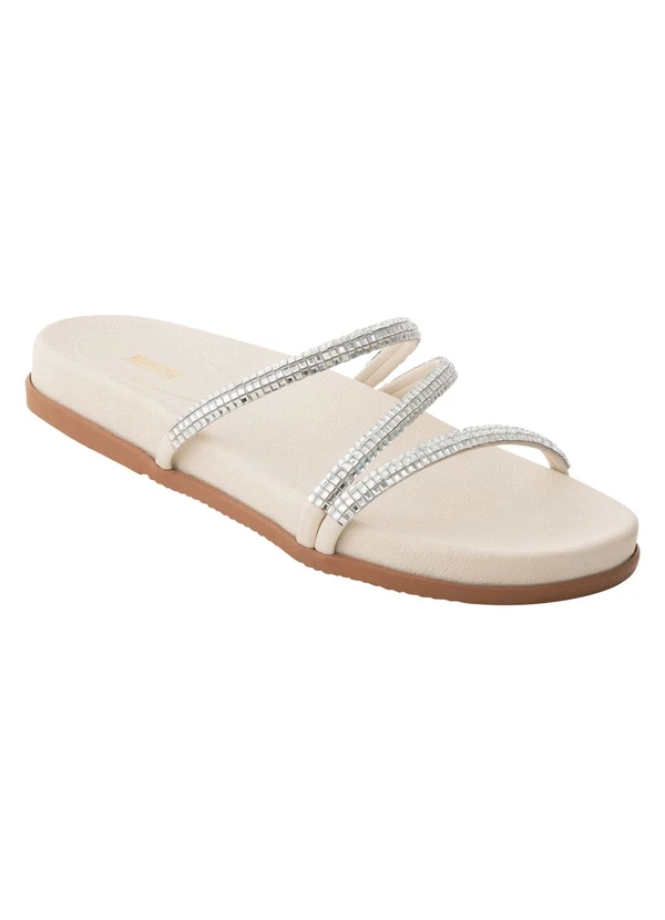 Chinelo desenvolvido em PVC e sintético, possui aplicação de stras no cabedal.