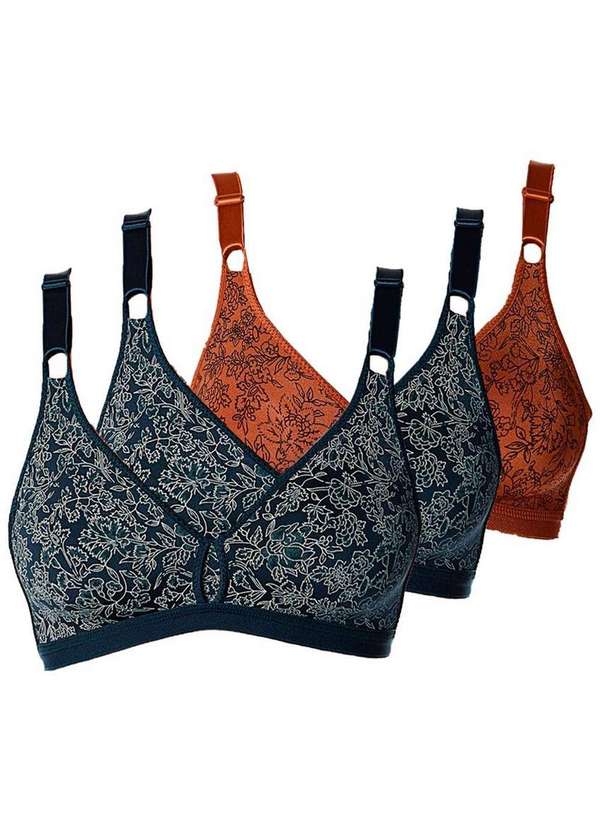 Característica: Sutiã com estampa floral tom sobre tom. Taças em elastano duplo. Sem aro e sem espuma. Ideal para sustentação ou prática esportiva. Cores: Marinho: Todos marinho Bronze: Todos bronze Marinho/Bronze: 2 marinho e 1 bronze Composição: 81% Poliamida e 19% Elastano.