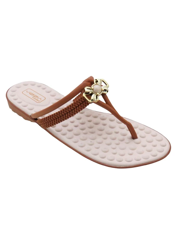 Rasteirinha desenvolvida em material de PVC com adereço dourado no cabedal. Palmilha Confort. Solado flexível.