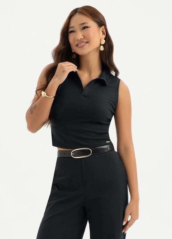 Cativa - Regata Gola Polo em Tecido Texturizado Preto