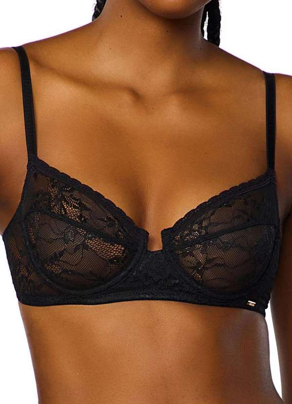 Características: Sutiã com aro e sem bojo Confeccionado em laise com detalhe de elástico rendado no decote Alças fixas ajustáveis Fecho em colchete nas costas Atende tamanho plus size Composição: 76% Poliamida,24% Elastano Forro Entremeio: 100% Poliamida