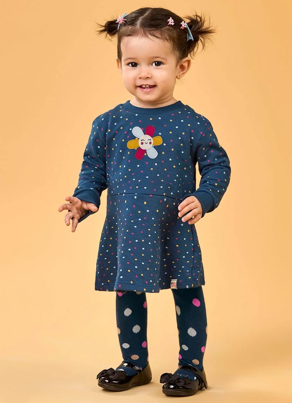 Elian - Vestido Bebê Menina Poá com Meia-Calça Azul