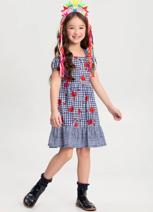 Alakazoo - Vestido Estampado Evasê com Babado na Barra Azul