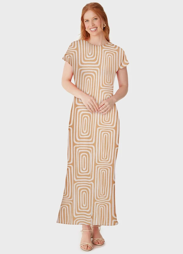 Malwee - Vestido Longo Geométrico em Viscolinho Bege