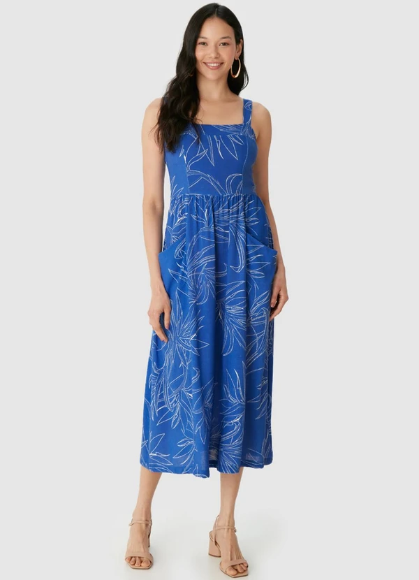 Malwee - Vestido Mídi Evasê Tropical Azul Royal