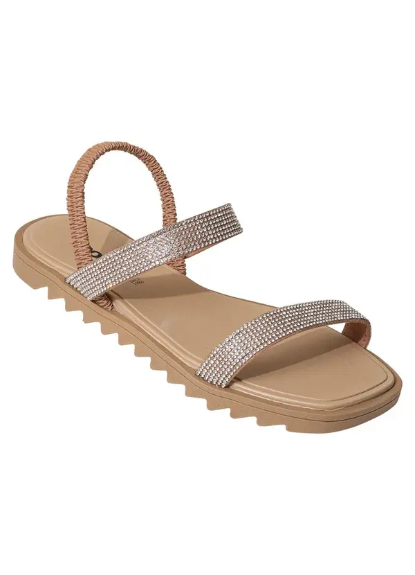 Rasteirinha Moleca, desenvolvido em sintético com detalhe de strass no cabedal e elástico na parte traseira. Palmilha confort. Solado flexível em PVC microexpandido.