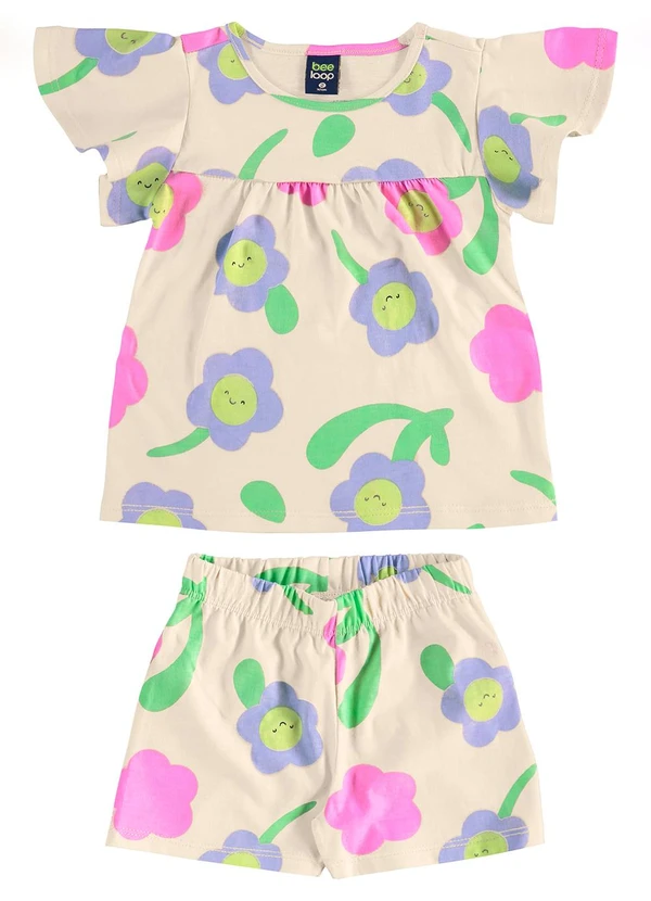 Bee Loop - Conjunto Florezinhas Blusa Short Bege