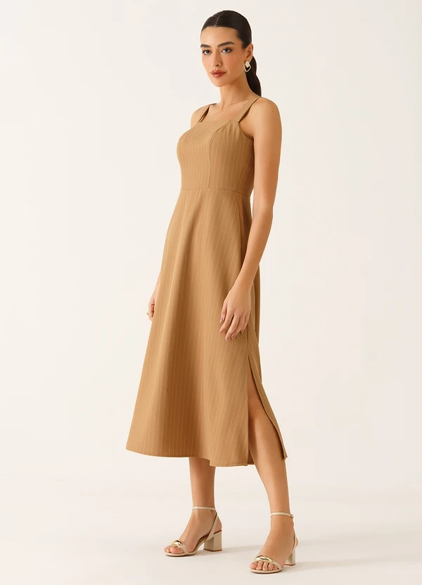 Principessa - Vestido Alfaiataria Midi em Viscose Listrada Camel Tricia