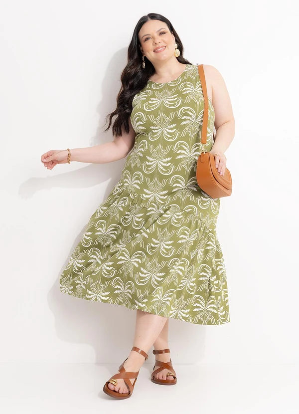 Vestido longo em malha com estampa de coqueiros verdes, modelagem ampla e recorte diagonal com babado. Leve e fresco, é perfeito para looks tropicais com toque elegante e descontraído.