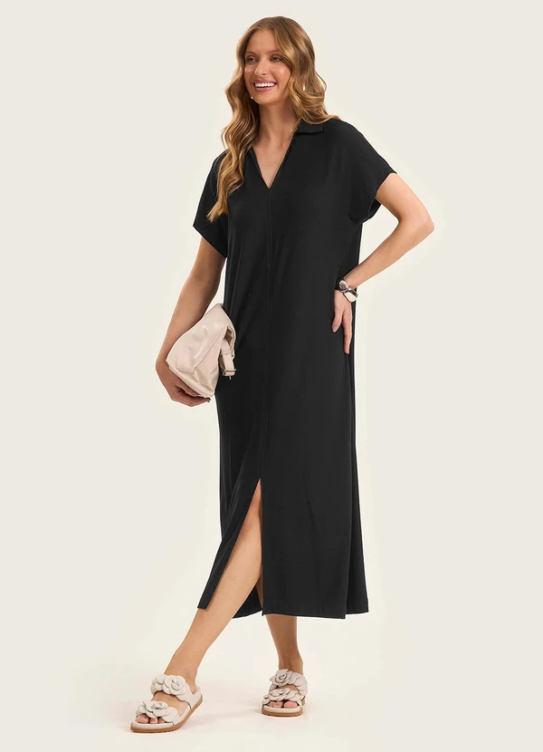 Rovitex - Vestido Midi em Visco Creponada Preto