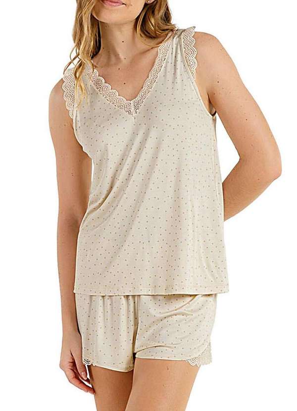Características: Pijama feminino curto Confeccionado em malha de viscose Blusa modelo regata com alças largas Decote V com renda delicada aplicada na parte da frente e costas Detalhe em renda nos ombros Shorts com cintura em elástico Detalhe de renda nas laterais da barra Modelo com design de estampa rotativa poá Composição: 96% Viscose,04% Elastano