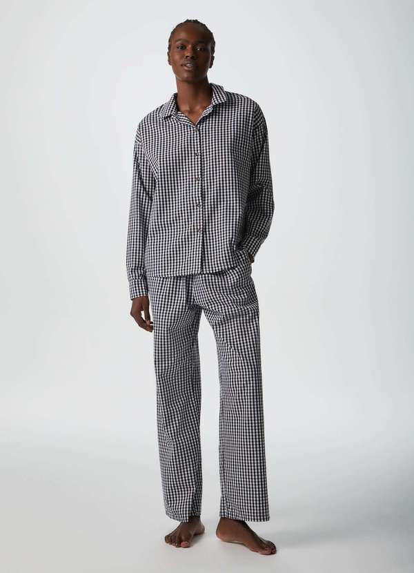 Conjunto de pijama elaborado em tricoline fio tinto, tecido plano 100% algodão, com uma padronagem clássica de vichy, um micro xadrez. Pijama composto por camisa manga longa, com gola resort, abertura de botões em toda vista frente e nos punhos, modelagem solta ao corpo e confortável. Calça em modelagem com shape reto e amplo, cós largo com elástico. Detalhes da peça: Tricoline fio tinto Modelagem ampla Manga longa Abotoamento frontal Calça reta Cós em elástico