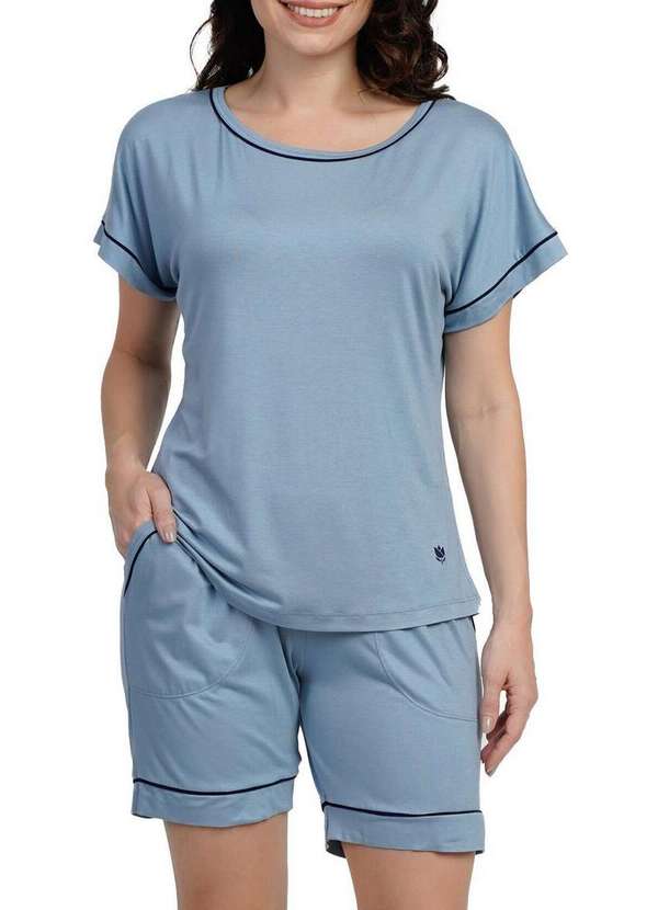 Características: Pijama Feminino Curto Bermudoll viscolycra azul elementar Conforto essencial com toque moderno É a escolha ideal para quem valoriza bem estar com estilo A blusa de manga curta traz detalhe em vivo azul marinho na barra das mangas, adicionando um contraste sutil e elegante ao visual Combina a suavidade e o frescor com a leve elasticidade do elastano, oferecendo um caimento perfeito e uma sensação de conforto extremo. Sua composição garante liberdade de movimentos, toque macio e leveza, tornando-se ideal para noites de descanso e momentos de relaxamento Além disso, a viscolycra proporciona durabilidade, mantendo a peça sempre bonita e confortável mesmo apos varias lavagens Destaque: Detalhes elegantes: Vivos em azul marinho nas mangas, barra e bolsos para um toque de sofisticação Modelagem confortável: Liberdade para relaxar com leveza Tecido respirável e durável: Ideal para o dia a dia e noites tranquilas Composição: 96% Viscose e 04% Elastano