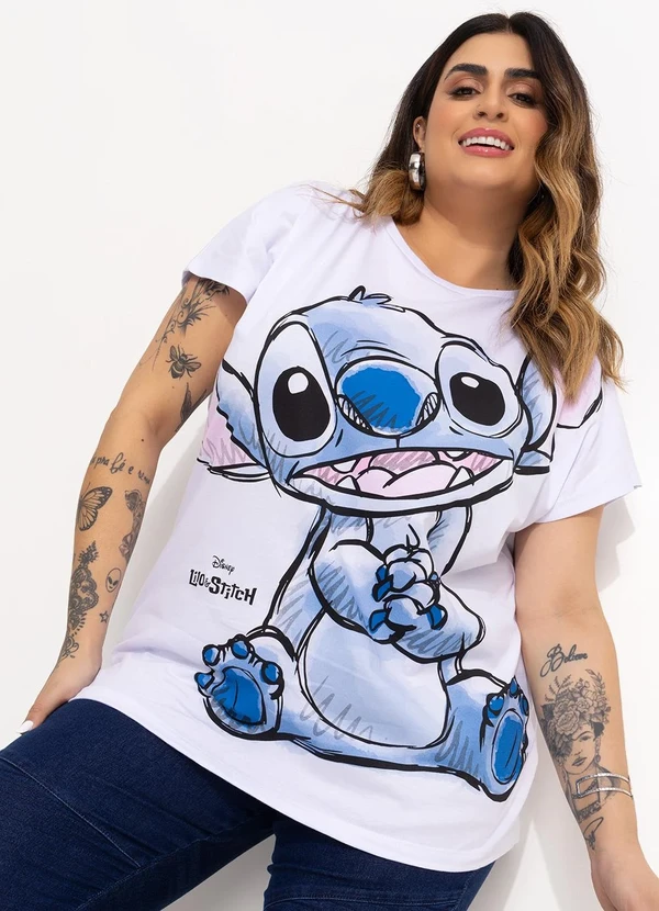 Camiseta Stitch branco, modelagem solta, modelo sem cava, decote redondo, manga curta, material malha de algodão penteado.