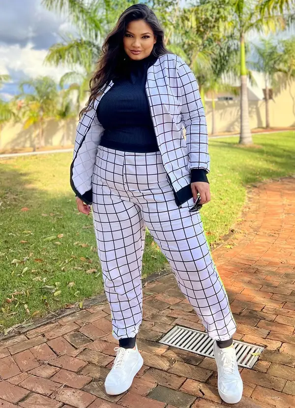 Marguerite - Jaqueta Bomber Xadrez Branco com Zíper Plus Size