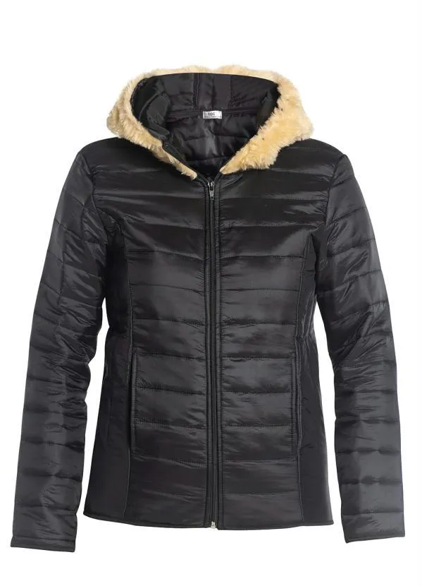 bonprix - Jaqueta Matelasse com Pelos no Capuz Preta