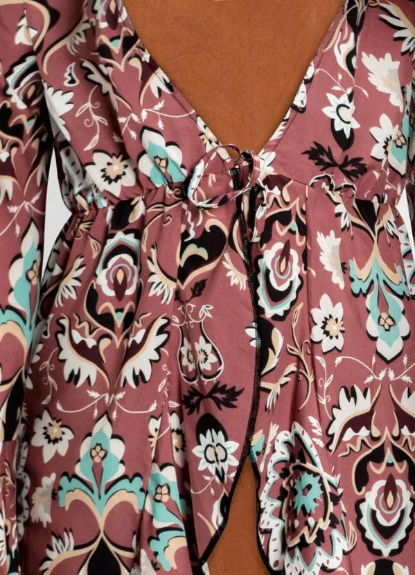 bonprix - Kimono com Amarração Floral Étnico Bordô