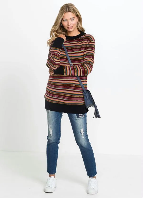 bonprix - Suéter de Tricô Alongado Listrado Preto