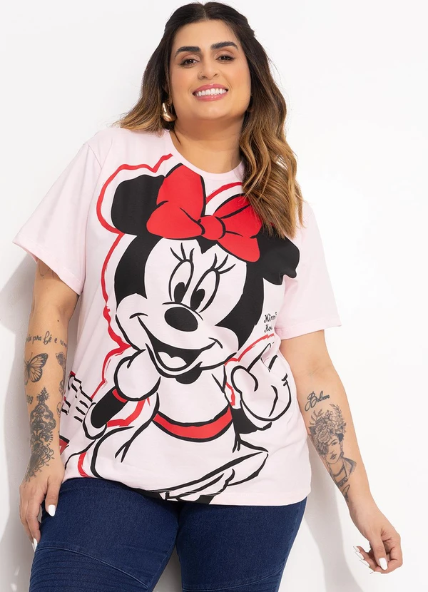 T-shirt Minnie rosa, modelagem solta, decote redondo, manga curta, comprimento tradicional, material malha de algodão penteado.