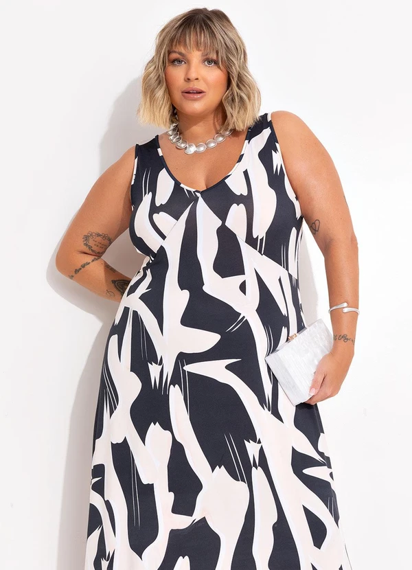 Vestido com modelagem solta e comprimento alongado, confeccionado em malha de poliéster com elastano. Decote V na frente, costas com decote quadrado, recorte central e fenda que traz movimento. Confortável, elegante e moderno.