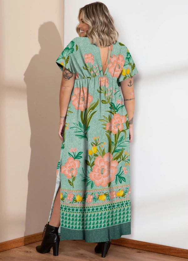 Quintess - Vestido Longo Floral Verde com Decote Profundo