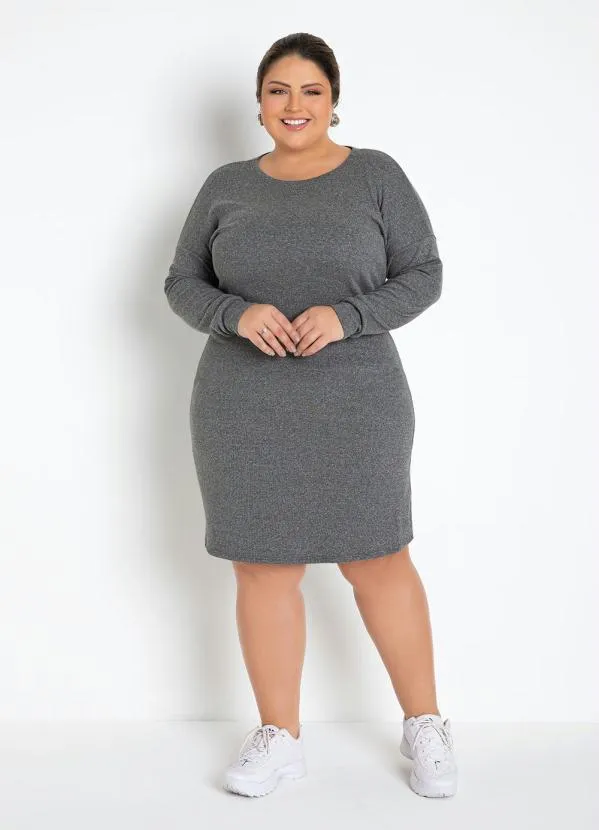 Basicamente - Vestido Mescla Escuro de Mangas Longas Plus Size