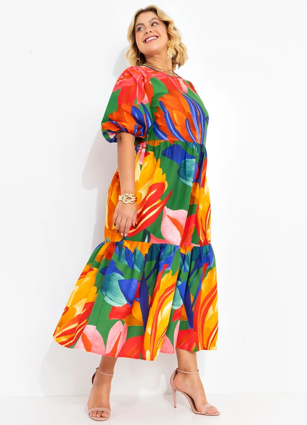 Este vestido estampado em tecido plano exibe um decote redondo e mangas bufantes, proporcionando um toque romântico e feminino. Com babados delicados na saia e comprimento midi, é uma escolha encantadora e versátil para diversas ocasiões.